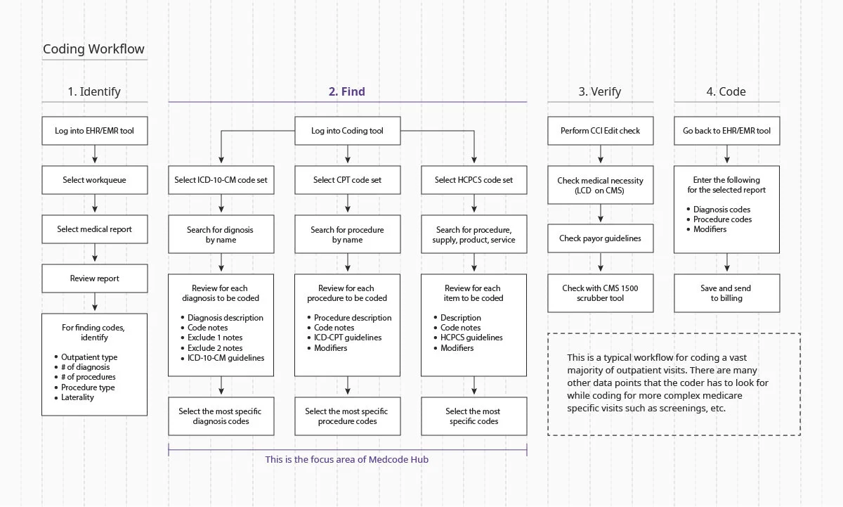 Understanding the Problem: There are approximately 68,000 diagnosis codes and 10,000 procedure codes. These codes and their guidelines are updated every year by CMS (Centers for Medicare and Medicaid Services) and AMA (American Medical Association). The Outpatient Medical coder uses three code books on a daily basis. As per guidelines, the coder must start their search for the code via the alphabetic index of each code book. This is the only way to arrive at the code which offers the highest level of specificity. However, since medical coders are on the clock for meeting their hourly targets, following the recommended workflow using the three code books takes time.