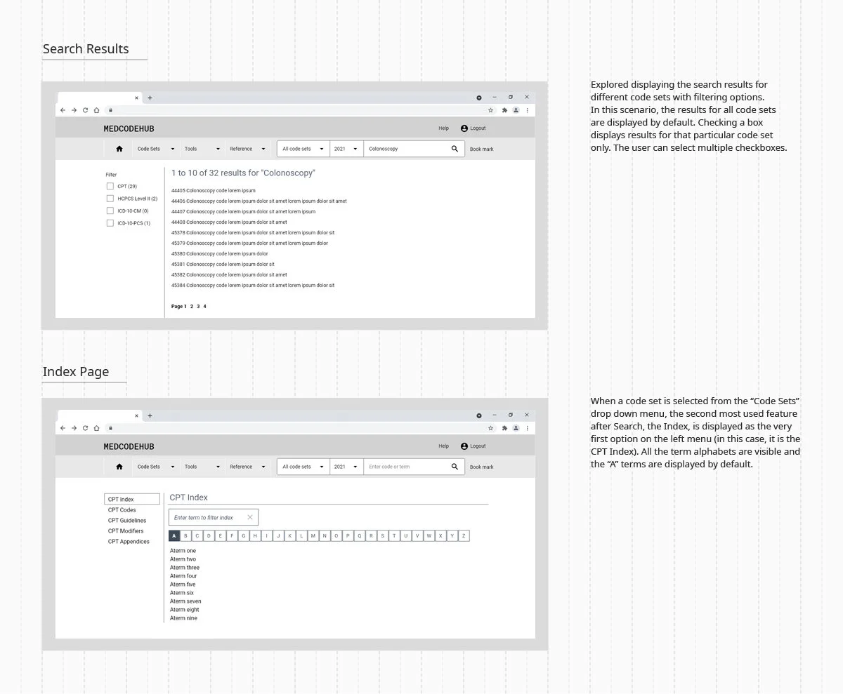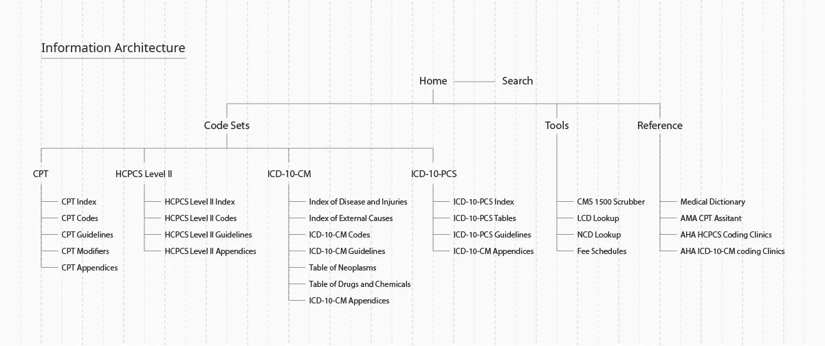 Information Architecture: Based on my research and explorations, I defined the information architecture of Medcode Hub to bring the search functionality to the forefront and provide quick and easy the access to the index of each code set.