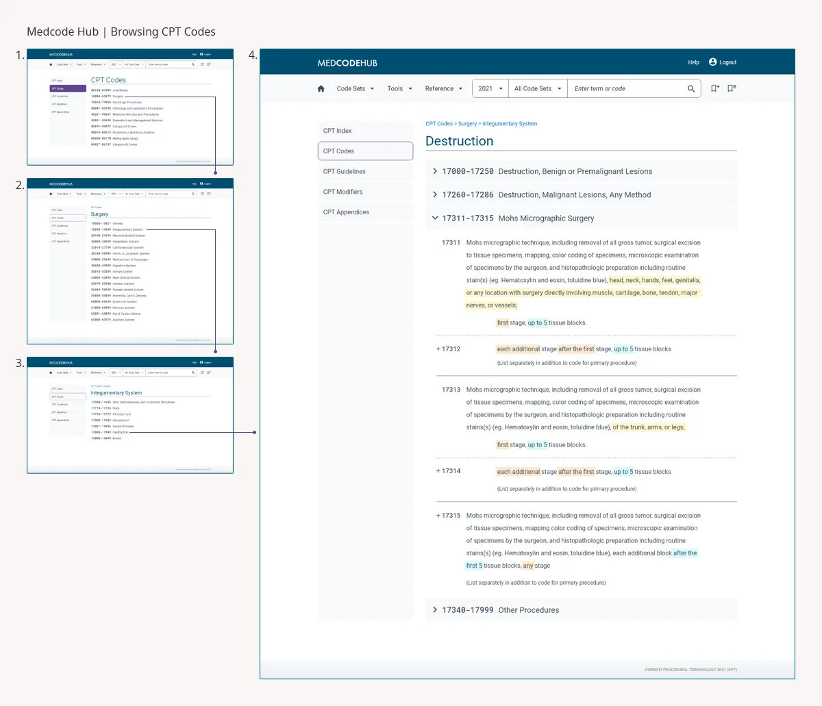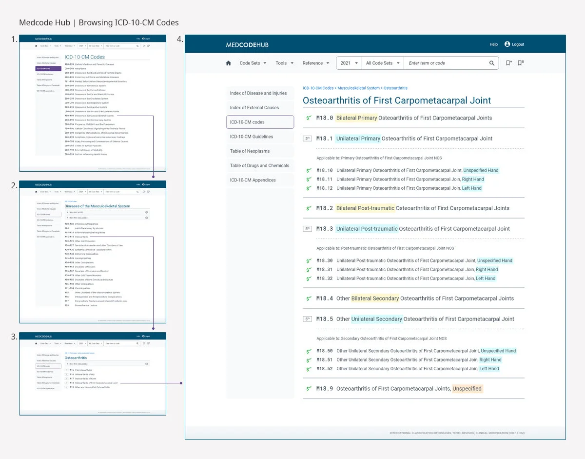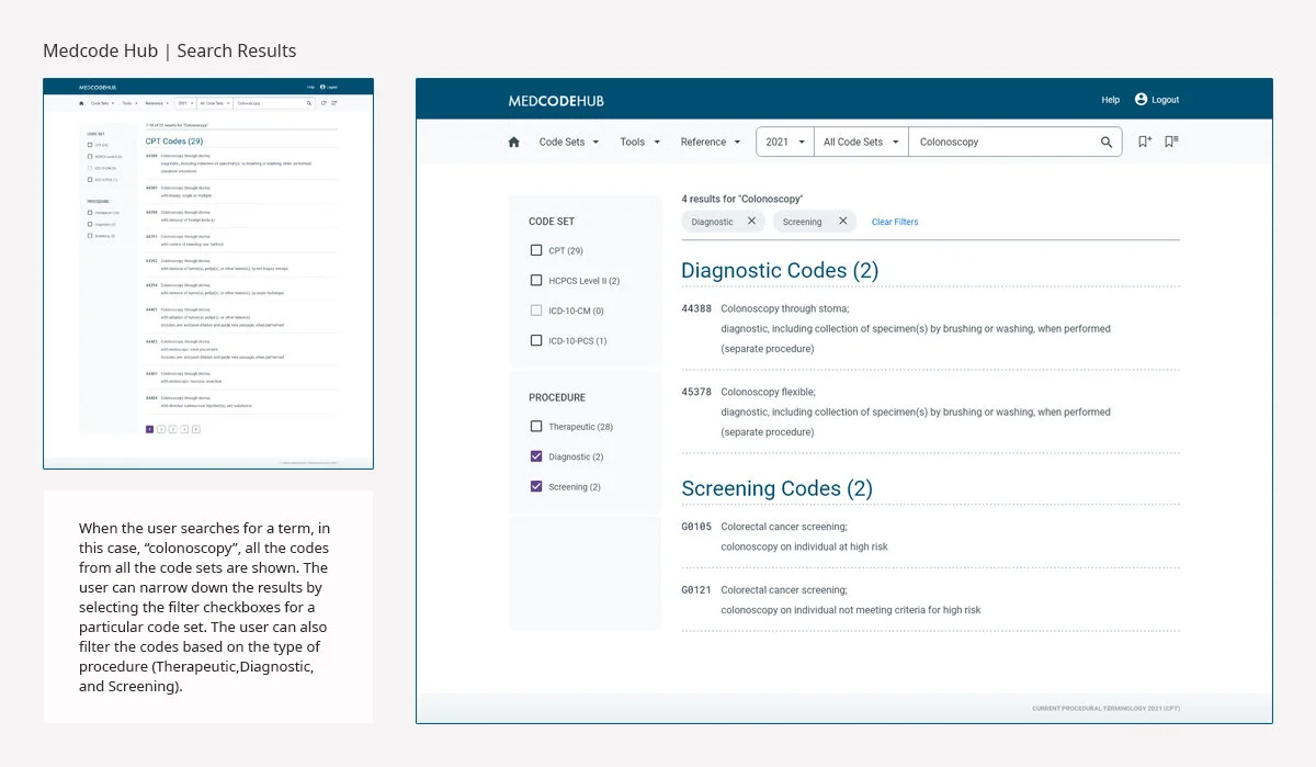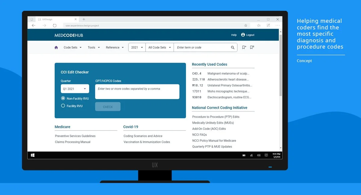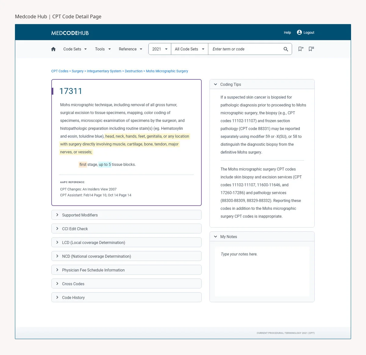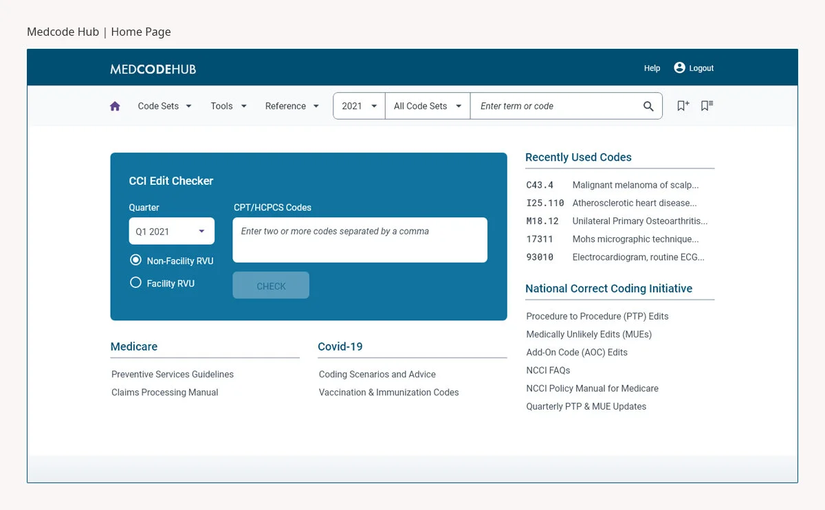 Overview: Medcode Hub is a concept project for an online coding tool that helps medical coders find the most current diagnosis and procedure codes easily and quickly, and remain compliant with the guidelines defined by CMS and AMA.