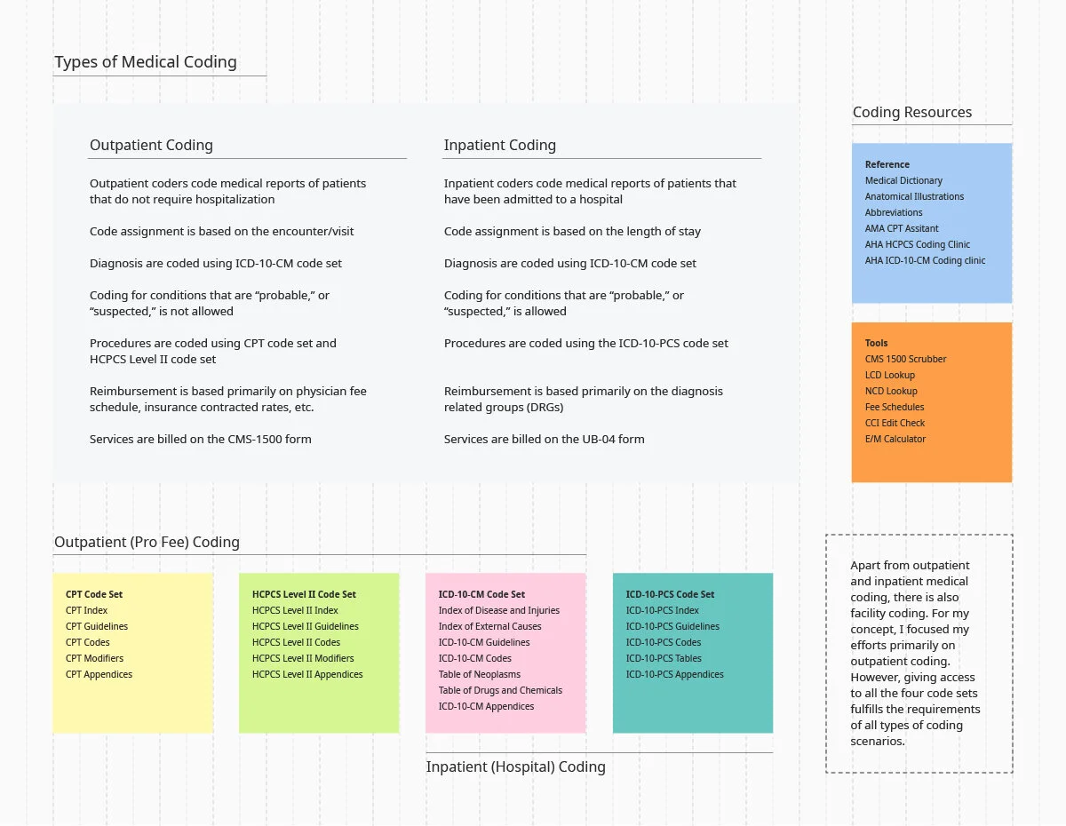 User Persona: I decided to focus the design of MedCode Hub for the outpatient medical coder since it offered more flexibility to customize it later for the inpatient medical coder. I met with two outpatient medical coders and learnt about how they work and what challenges they face.